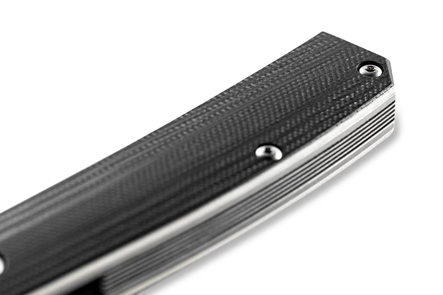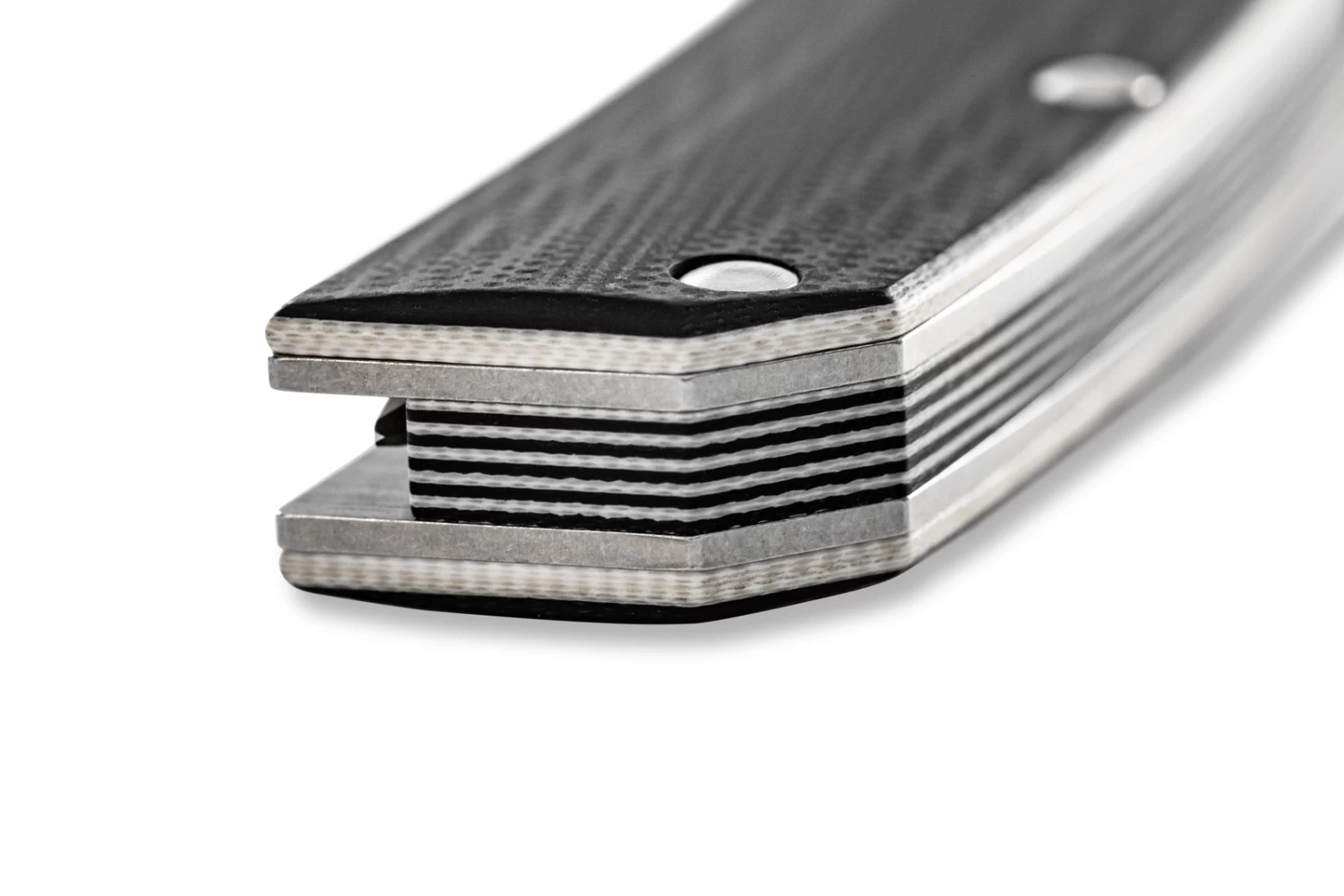 Blurring the lines between traditional design and modern technology, the 601 Tengu epitomises the style of Jared Oeser’s custom designs. This slim and classy flipper is packed with detail, from the CPM-20CV blade to the dual colored G10 handles. Complete with a black leather carry sleeve, the Tengu is bound to impress those looking for something different.