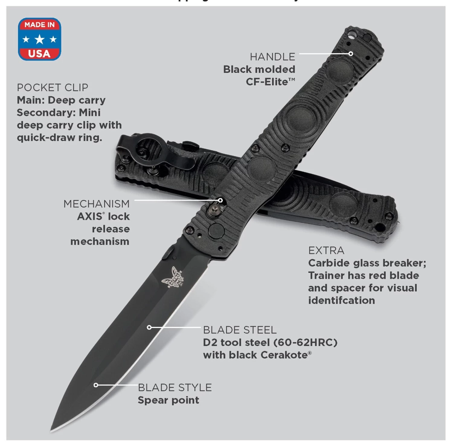 Designed by Greg Thompson, the new 391BK SOCP folder blade incorporates a myriad of functional features. The rapid deployment ring and tip-down carry enhance the speed at which this knife can be deployed, and the smooth handle dimples allow for confident transition in your hand. Redesigned with Benchmade’s AXIS lock technology, this knife won’t leave you fumbling for functionality in stressful situations. Carbide glass breaker on pommel.