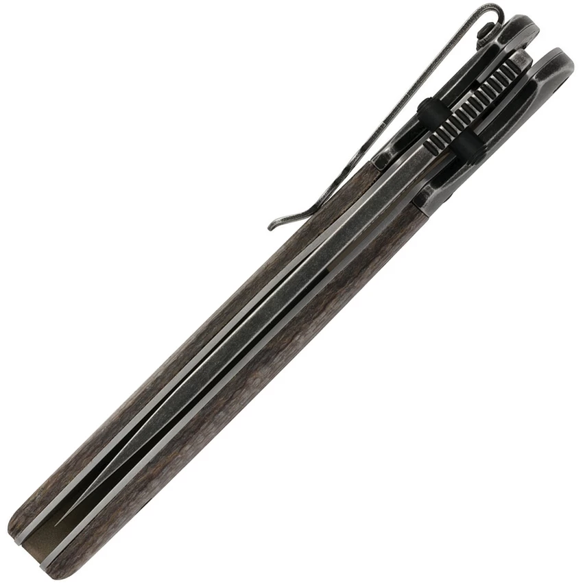 Folding liner lock hollow-ground 7Cr stainless steel drop point blade with black stonewash finish, ambidextrous thumb studs, anti-skid grooves on back spine, mottled hemp Micarta handle, metal pocket clip. This knife is in Browning’s Black Label Series.