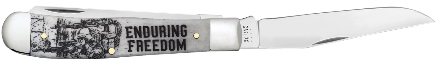 This all-new Trapper collection showcases some highly detailed handle artwork to help preserve the stories behind some of the USA’s most defining moments. The Trapper gets its name from the consumer it was designed for. Because of its basic trapping and skinning blades and its light weight, it is a must-have knife for those who trap small game. It is a jack knife with two full length blades; a slender Clip and a long Spey. The Clip blade is commonly used as a multi-purpose blade and preferred for detail work while the Spey blade is commonly used as an all-purpose utility blade. This knife is constructed with Case Tru-Sharp™ stainless steel which is a special high-carbon steel that helps the blades hold an edge longer than conventional steel. It also offers extraordinary blade strength and corrosion resistance.