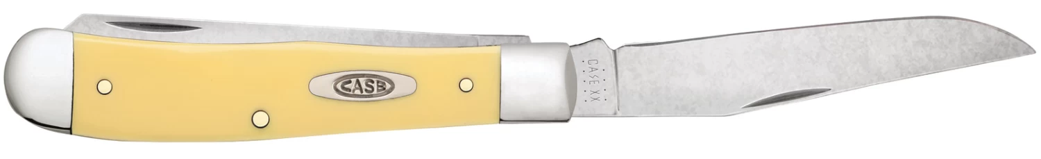 This Trapper is a part of the Yellow Synthetic Family. The distinctive yellow handle brightens this family while maintaining its toughness, making it one of the most beloved in the Case line. The Trapper gets its name from the consumer it was designed for. Because of its basic trapping and skinning blades and its light weight, it is a must-have knife for those who trap small game. It is a jack knife with two full length blades; a slender Clip and a long Spey. The Clip blade is commonly used as a multi-purpose blade and preferred for detail work while the Spey blade is commonly used as an all-purpose utility blade. This knife is constructed with Case Tru-Sharp™ stainless steel which is a special high-carbon steel that helps the blades hold an edge longer than conventional steel. It also offers extraordinary blade strength and corrosion resistance.