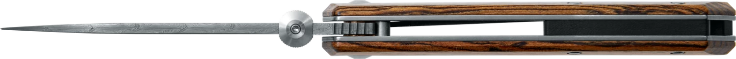 - 364 layer ATS-34 + PMC-27 Damascus steel blade showcases a detailed Ladder pattern