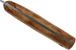 Helle Temagami CAThe Helle Temagami is a bushcrafting knife, designed by survival guru Les Stroud. The knife has a very nice fit and is perfectly designed for survival and bushcraft purposes. The handle is made of beautiful wavy birch. The handle is shaped, polished and oiled by hand to give it its unique character. The blade is full-tang, which means that the steel by runs through to the end of the handle. The blade is a hard stainless steel, laminated between two layers of 18/8 stainless steel. This core is sharpened incredibly sharp and is very easy to sharpen yourself. This knife is also available with a full stainless steel blade.