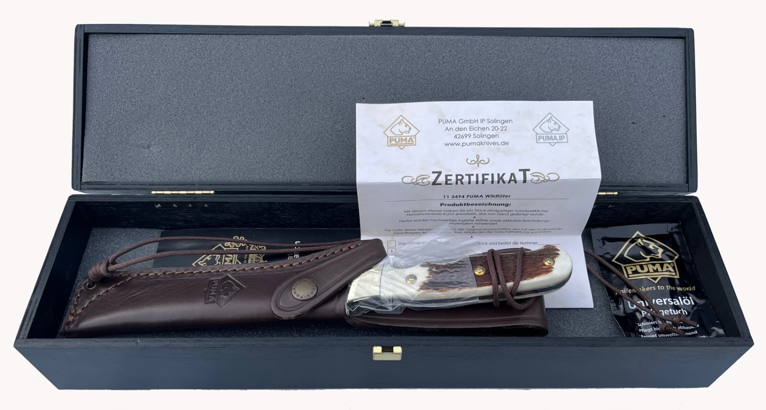 The Puma “Wildtöter” is a super elegant hunting knife, which is characterized by its beauty, but also by its robustness. Stag handle, high quality leather sheath, black wooden presentation box and certificate make this knife a great collectible for generations to come.