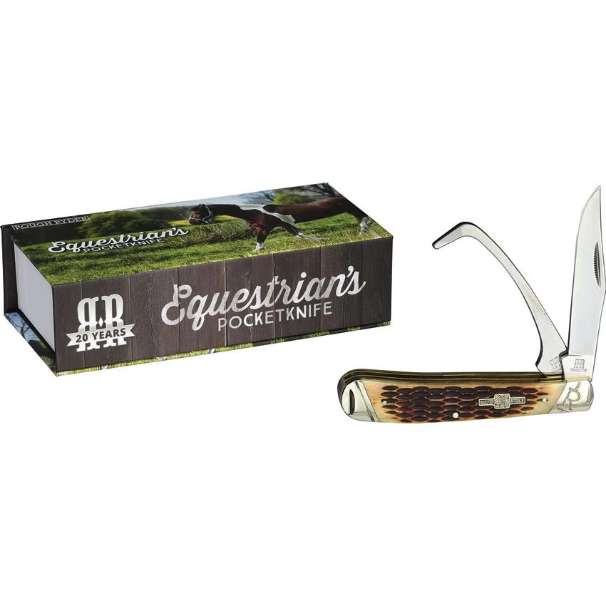 The handles are Jigged Amber Bone with nickel silver pinched Slant ‘R’ bolsters and Rough Ryder shield. The Equestrian knife was designed for those who love and take care of horses. Built on a Trapper, the Clip blade and hoof pick make this knife a great tool for both horses and riders. The Clip blade is a multi-purpose blade that is preferred for its versatility. The hoof pick is a common tool for those that care for horses. Each knife comes with a decorative magnetic clasp collector’s box.